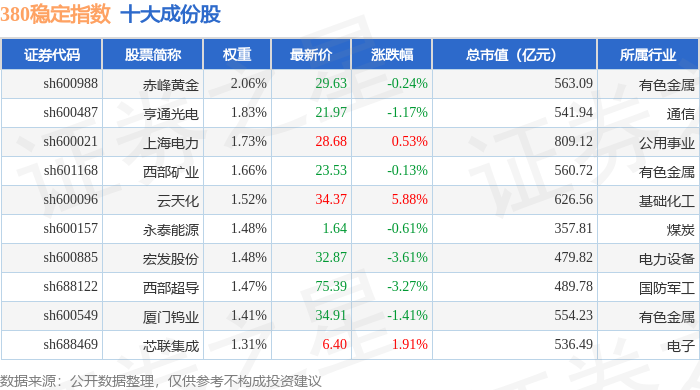 380稳定(000142)指数十大成份股详情如下: