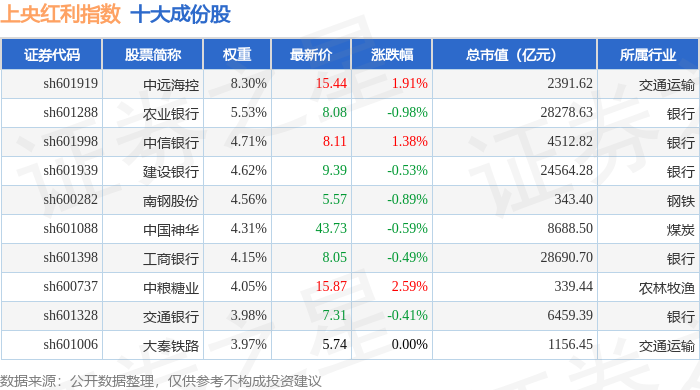 证券之星消息,11月7日,上央红利(000152)指数报收于2967.38点,涨0.02%,成交247.71亿元,换手率0.2%。当日该指数成份股中,上涨的有14家,中粮糖业以2.59%的涨幅领涨,下跌的有15家,苏美达以4.69%的跌幅领跌。
