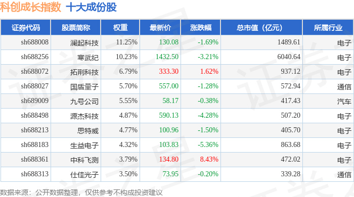 证券之星消息,11月7日,科创成长(000690)指数报收于1800.09点,跌1.08%,成交365.01亿元,换手率2.07%。当日该指数成份股中,上涨的有10家,中科飞测以8.43%的涨幅领涨,下跌的有39家,生益电子以5.36%的跌幅领跌。