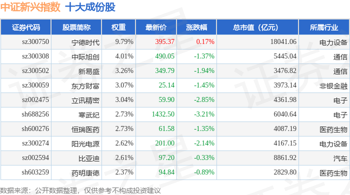 证券之星消息,11月7日,中证新兴(000964)指数报收于11241.39点,跌0.86%,成交2734.73亿元,换手率1.43%。当日该指数成份股中,上涨的有27家,通威股份以6.77%的涨幅领涨,下跌的有71家,传音控股以4.39%的跌幅领跌。