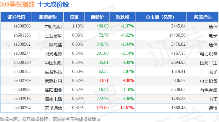 300等权(000984)指数十大成份股详情如下: