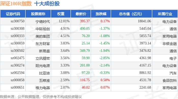 证券之星消息,11月7日,深证100R(399004)指数报收于8353.26点,跌0.61%,成交1987.89亿元,换手率1.12%。当日该指数成份股中,上涨的有36家,天孚通信以12.67%的涨幅领涨,下跌的有60家,沪电股份以4.23%的跌幅领跌。