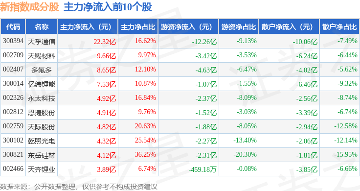 资金流向方面,新指数(399100)成份股当日主力资金净流出合计241.66亿元,游资资金净流入合计15.43亿元,散户资金净流入合计226.23亿元。成份股资金流向详情见下表: