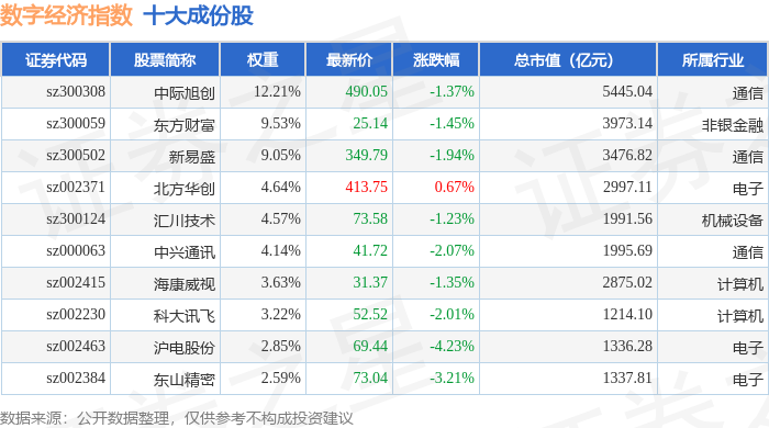 数字经济(399262)指数十大成份股详情如下: