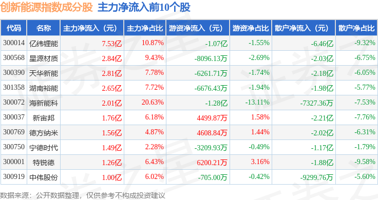 资金流向方面,创新能源(399266)指数成份股当日主力资金净流入合计17.67亿元,游资资金净流出合计1.67亿元,散户资金净流出合计16.0亿元。成份股资金流向详情见下表: