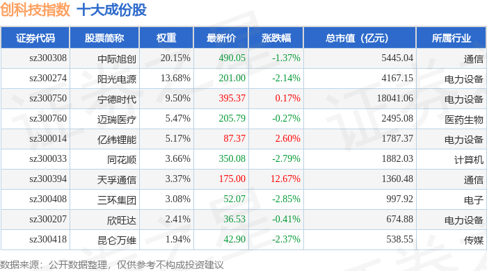创科技(399276)指数十大成份股详情如下: