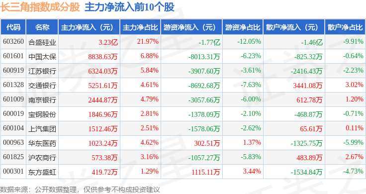 资金流向方面,长三角(399355)指数成份股当日主力资金净流出合计44.62亿元,游资资金净流入合计12.23亿元,散户资金净流入合计32.39亿元。成份股资金流向详情见下表: