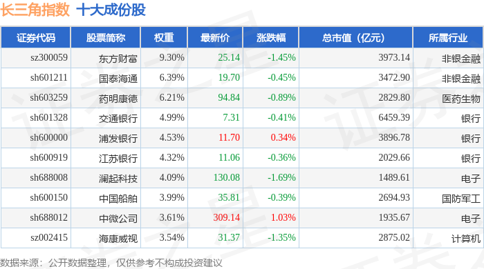 长三角(399355)指数十大成份股详情如下: