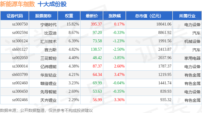 证券之星消息,11月7日,新能源车(399417)指数报收于4026.64点,涨1.0%,成交1429.16亿元,换手率4.8%。当日该指数成份股中,上涨的有33家,天华新能以15.32%的涨幅领涨,下跌的有17家,科达利以6.15%的跌幅领跌。
