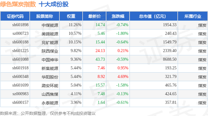 证券之星消息,11月7日,绿色煤炭(399436)指数报收于4355.66点,跌0.16%,成交107.76亿元,换手率1.43%。当日该指数成份股中,上涨的有12家,华阳股份以4.69%的涨幅领涨,下跌的有13家,郑州煤电以2.66%的跌幅领跌。