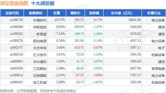证券之星消息,11月7日,深证装备(399636)指数报收于7968.76点,跌0.65%,成交1545.82亿元,换手率3.29%。当日该指数成份股中,上涨的有33家,科士达以9.99%的涨幅领涨,下跌的有46家,大洋电机以4.06%的跌幅领跌。