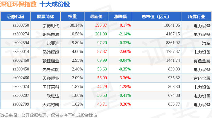 证券之星消息,11月7日,深证环保(399638)指数报收于7960.86点,涨0.74%,成交1117.88亿元,换手率2.43%。当日该指数成份股中,上涨的有26家,天华新能以15.32%的涨幅领涨,下跌的有12家,科达利以6.15%的跌幅领跌。