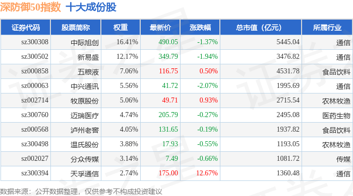 证券之星消息,11月7日,深防御50(399671)指数报收于9511.15点,跌0.4%,成交662.82亿元,换手率1.69%。当日该指数成份股中,上涨的有21家,天孚通信以12.67%的涨幅领涨,下跌的有28家,信立泰以3.1%的跌幅领跌。
