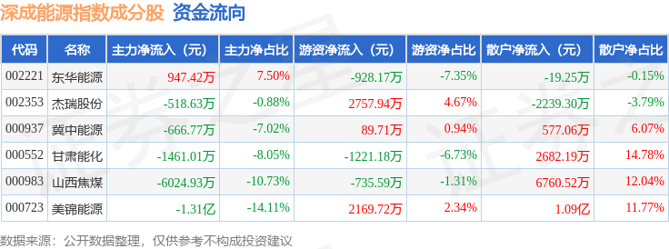 资金流向方面,深成能源(399680)指数成份股当日主力资金净流出合计2.08亿元,游资资金净流入合计2132.43万元,散户资金净流入合计1.87亿元。成份股资金流向详情见下表: