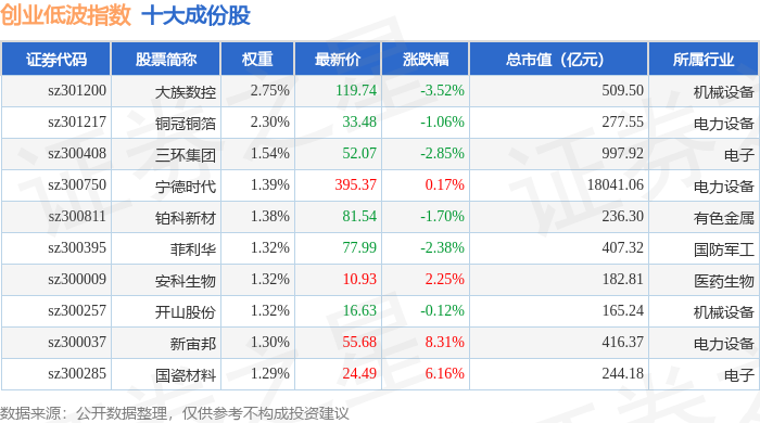 证券之星消息,11月7日,创业低波(399692)指数报收于3988.66点,涨0.14%,成交480.26亿元,换手率1.82%。当日该指数成份股中,上涨的有49家,东岳硅材以20.04%的涨幅领涨,下跌的有50家,三博脑科以5.29%的跌幅领跌。