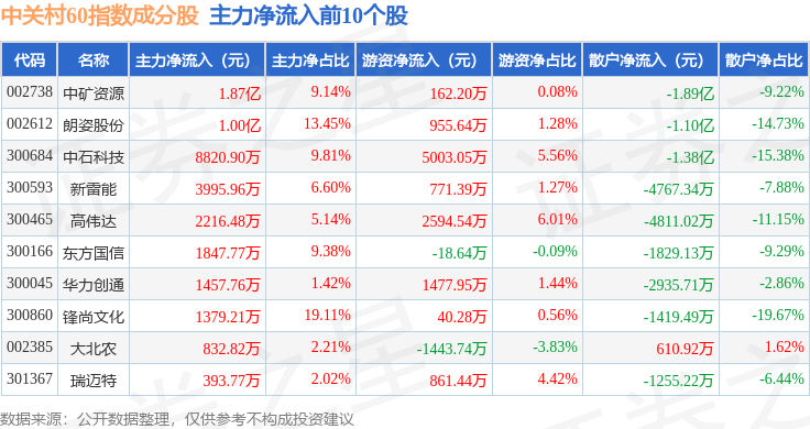 资金流向方面,中关村60(399697)指数成份股当日主力资金净流出合计31.11亿元,游资资金净流入合计9.67亿元,散户资金净流入合计21.44亿元。成份股资金流向详情见下表: