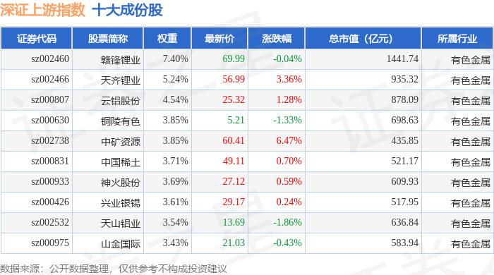 证券之星消息,11月7日,深证上游(399704)指数报收于6221.31点,涨0.59%,成交570.8亿元,换手率2.77%。当日该指数成份股中,上涨的有28家,盛新锂能以9.99%的涨幅领涨,下跌的有22家,云南锗业以7.45%的跌幅领跌。
