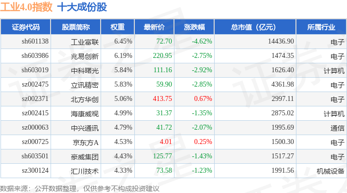 工业4.0(399803)指数十大成份股详情如下: