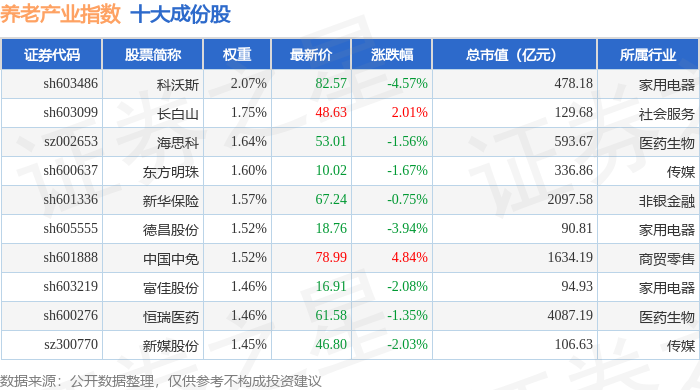 资金流向方面,养老产业(399812)指数成份股当日主力资金净流入合计1.03亿元,游资资金净流出合计2.06亿元,散户资金净流入合计1.03亿元。成份股资金流向详情见下表: