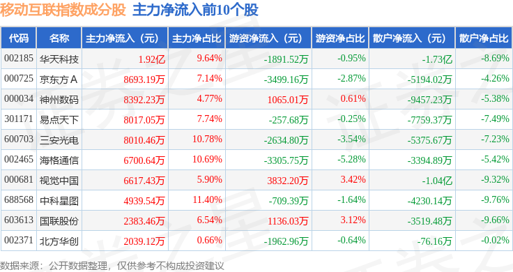 资金流向方面,移动互联(399970)指数成份股当日主力资金净流出合计132.44亿元,游资资金净流入合计40.04亿元,散户资金净流入合计92.4亿元。成份股资金流向详情见下表: