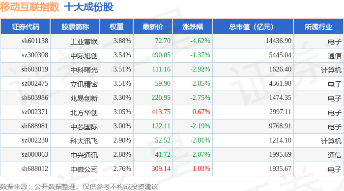 证券之星消息,11月7日,移动互联(399970)指数报收于4480.84点,跌1.67%,成交1515.86亿元,换手率1.91%。当日该指数成份股中,上涨的有13家,闻泰科技以9.7%的涨幅领涨,下跌的有86家,神州信息以8.22%的跌幅领跌。