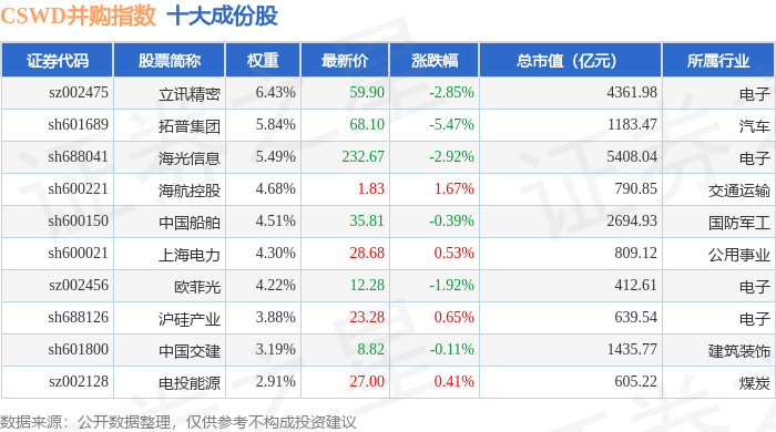 资金流向方面,CSWD并购(399992)指数成份股当日主力资金净流出合计29.78亿元,游资资金净流入合计8.43亿元,散户资金净流入合计21.35亿元。成份股资金流向详情见下表: