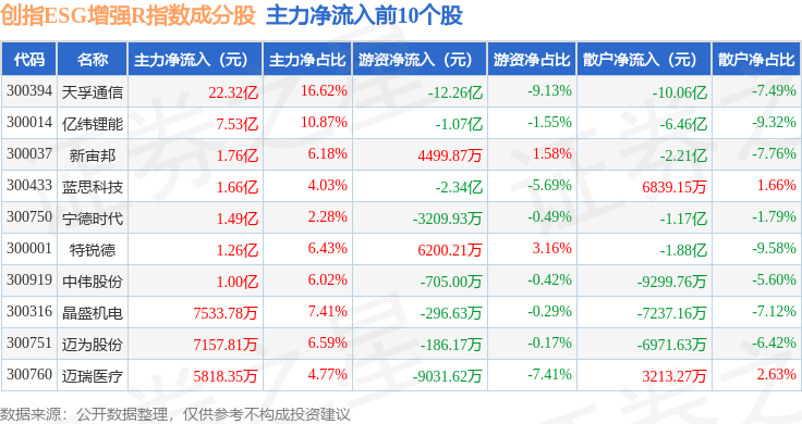 资金流向方面,创指ESG增强R(470034)指数成份股当日主力资金净流出合计3.33亿元,游资资金净流入合计2.2亿元,散户资金净流入合计1.13亿元。成份股资金流向详情见下表: