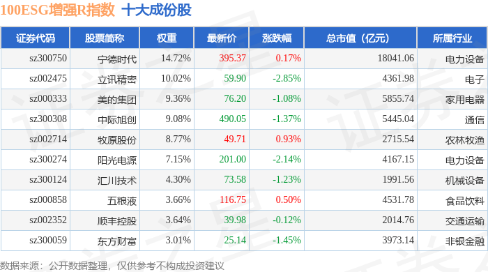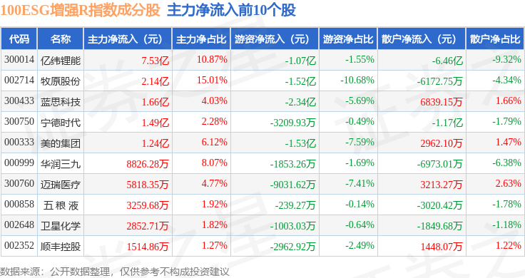 资金流向方面,100ESG增强R(470033)指数成份股当日主力资金净流出合计46.48亿元,游资资金净流入合计10.44亿元,散户资金净流入合计36.04亿元。成份股资金流向详情见下表: