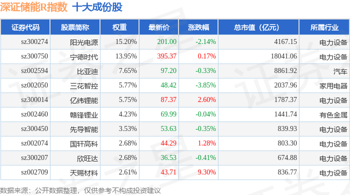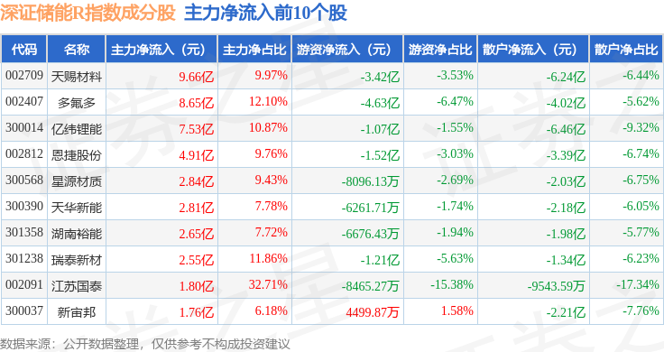 资金流向方面,深证储能R(470036)指数成份股当日主力资金净流入合计24.32亿元,游资资金净流出合计5.82亿元,散户资金净流出合计18.49亿元。成份股资金流向详情见下表: