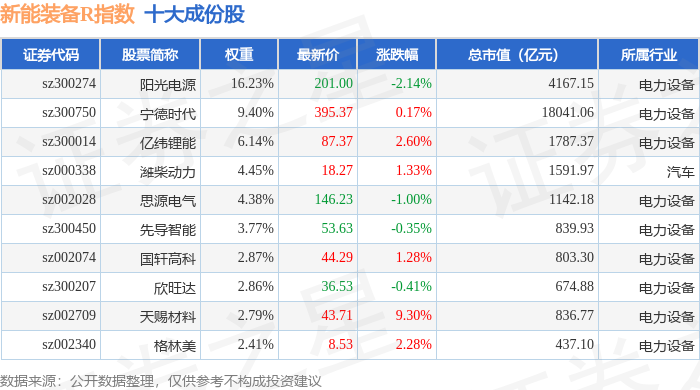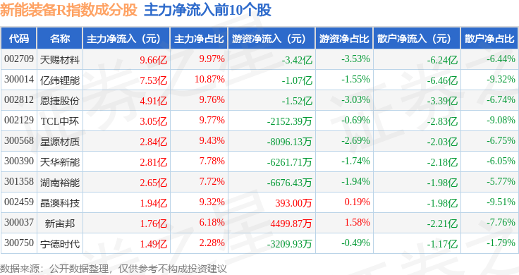 资金流向方面,新能装备R(470043)指数成份股当日主力资金净流入合计23.37亿元,游资资金净流出合计2.68亿元,散户资金净流出合计20.69亿元。成份股资金流向详情见下表: