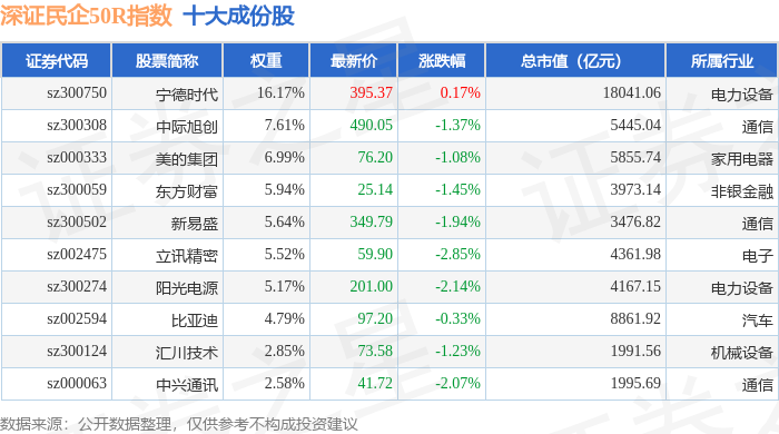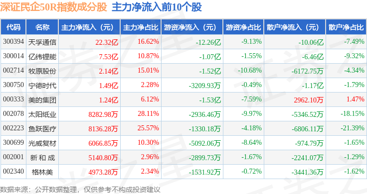 资金流向方面,深证民企50R(470057)指数成份股当日主力资金净流出合计48.58亿元,游资资金净流入合计9.15亿元,散户资金净流入合计39.43亿元。成份股资金流向详情见下表: