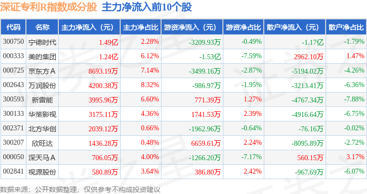 资金流向方面,深证专利R(470067)指数成份股当日主力资金净流出合计53.9亿元,游资资金净流入合计16.04亿元,散户资金净流入合计37.86亿元。成份股资金流向详情见下表: