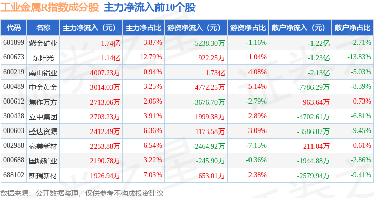 资金流向方面,工业金属R(480043)指数成份股当日主力资金净流出合计16.21亿元,游资资金净流入合计7.37亿元,散户资金净流入合计8.84亿元。成份股资金流向详情见下表: