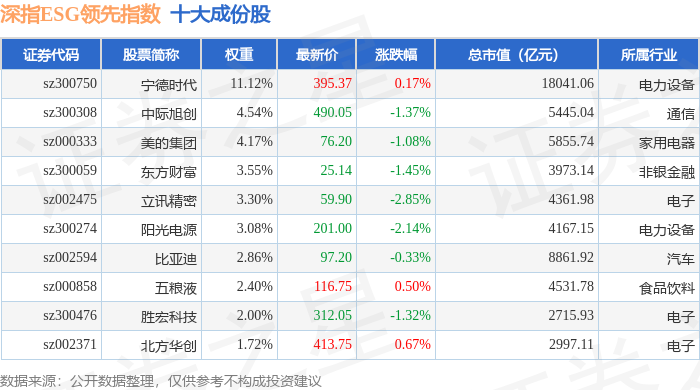 资金流向方面,深指ESG领先(970029)指数成份股当日主力资金净流出合计75.07亿元,游资资金净流入合计19.54亿元,散户资金净流入合计55.53亿元。成份股资金流向详情见下表: