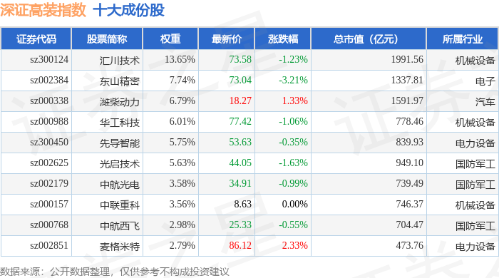 深证高装(970037)指数十大成份股详情如下: