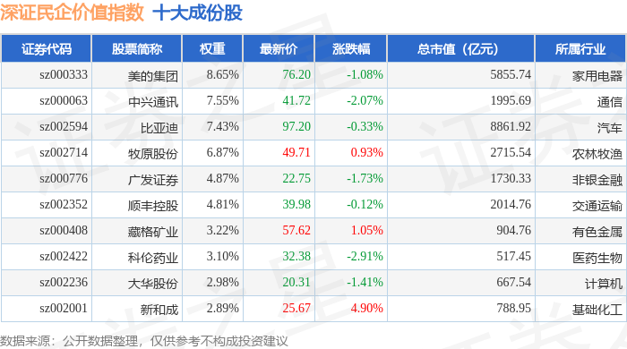 资金流向方面,深证民企价值(970072)指数成份股当日主力资金净流出合计11.18亿元,游资资金净流入合计2.81亿元,散户资金净流入合计8.37亿元。成份股资金流向详情见下表: