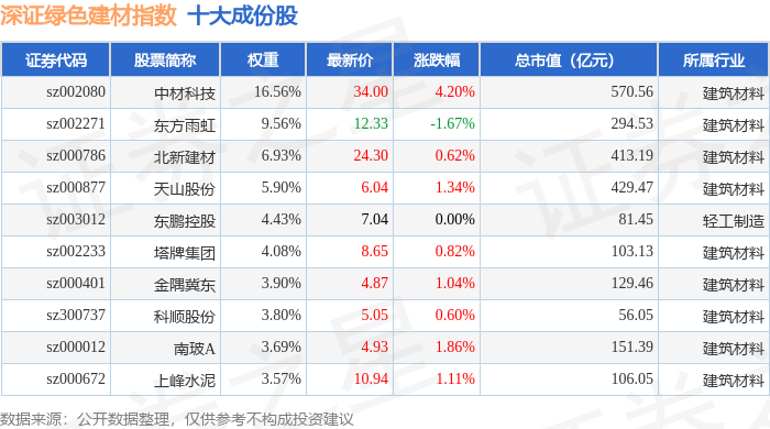 深证绿色建材(970077)指数十大成份股详情如下:
