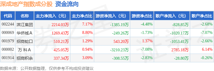 资金流向方面,深成地产(971001)指数成份股当日主力资金净流入合计4756.06万元,游资资金净流出合计4610.02万元,散户资金净流出合计146.04万元。成份股资金流向详情见下表:
