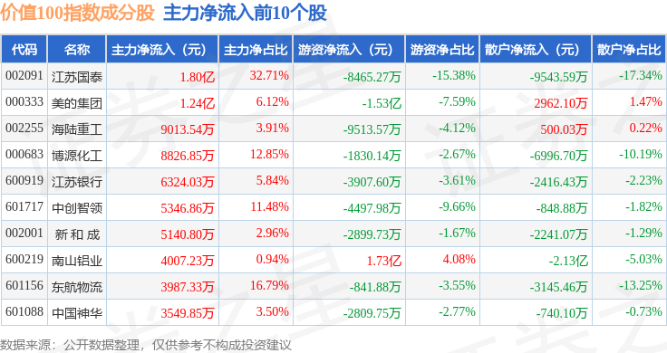 资金流向方面,价值100(980081)指数成份股当日主力资金净流出合计16.04亿元,游资资金净流入合计5.26亿元,散户资金净流入合计10.78亿元。成份股资金流向详情见下表: