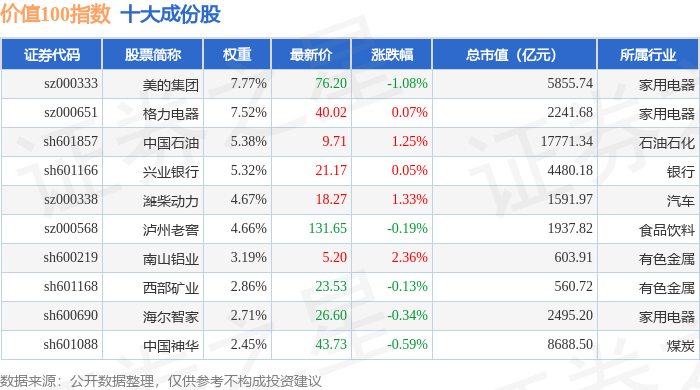 证券之星消息,11月7日,价值100(980081)指数报收于4454.5点,涨0.48%,成交718.82亿元,换手率1.03%。当日该指数成份股中,上涨的有63家,海陆重工以10.02%的涨幅领涨,下跌的有36家,苏美达以4.69%的跌幅领跌。