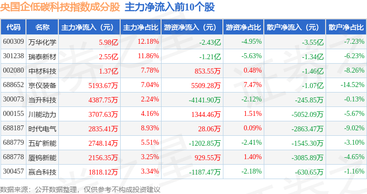 资金流向方面,央国企低碳科技(980082)指数成份股当日主力资金净流出合计15.08亿元,游资资金净流入合计2.49亿元,散户资金净流入合计12.59亿元。成份股资金流向详情见下表: