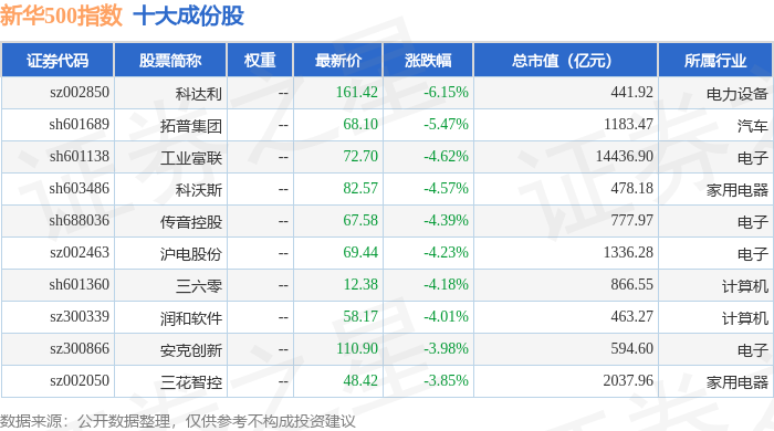 资金流向方面,新华500(989001)指数成份股当日主力资金净流出合计207.64亿元,游资资金净流入合计68.05亿元,散户资金净流入合计139.59亿元。成份股资金流向详情见下表: