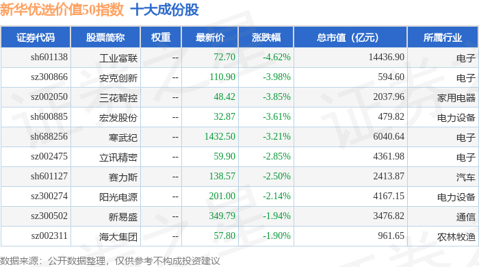 证券之星消息,11月7日,新华优选价值50(989004)指数报收于2197.54点,跌0.73%,成交1538.21亿元,换手率0.89%。当日该指数成份股中,上涨的有19家,卫星化学以2.56%的涨幅领涨,下跌的有31家,工业富联以4.62%的跌幅领跌。