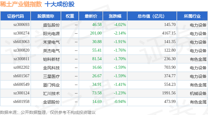 稀土产业链(989013)指数十大成份股详情如下: