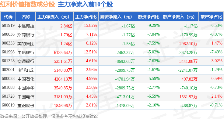 资金流向方面,红利价值(989016)指数成份股当日主力资金净流入合计7364.49万元,游资资金净流出合计6.2亿元,散户资金净流入合计5.46亿元。成份股资金流向详情见下表: