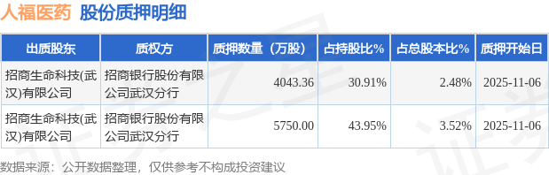 证券之星消息,人福医药(600079)11月7日公开信息显示,股东招商生命科技(武汉)有限公司向招商银行股份有限公司武汉分行合计质押9793.36万股,占总股本6.0%。质押详情见下表: