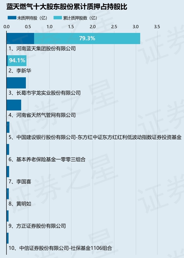 截止本公告日,股东河南蓝天集团股份有限公司已累计质押股份2.46亿股,占其持股总数的79.3%,股东李新华已累计质押股份4400.0万股,占其持股总数的94.1%。本次质押后蓝天燃气十大股东的累计质押股份占持股比例(占持股比例的计算以公司最新一期财务报表公布的十大股东的持股总数为基准)见下图: