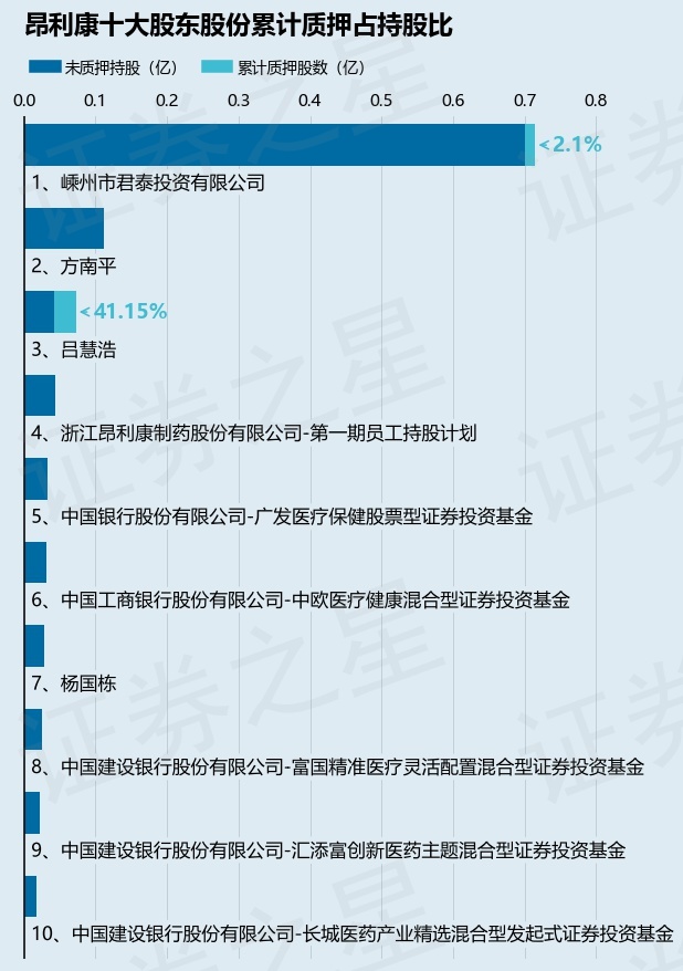 截止本公告日,股东嵊州市君泰投资有限公司已累计质押股份150.0万股,占其持股总数的2.1%,股东吕慧浩已累计质押股份298.5万股,占其持股总数的41.15%。本次质押后昂利康十大股东的累计质押股份占持股比例(占持股比例的计算以公司最新一期财务报表公布的十大股东的持股总数为基准)见下图: