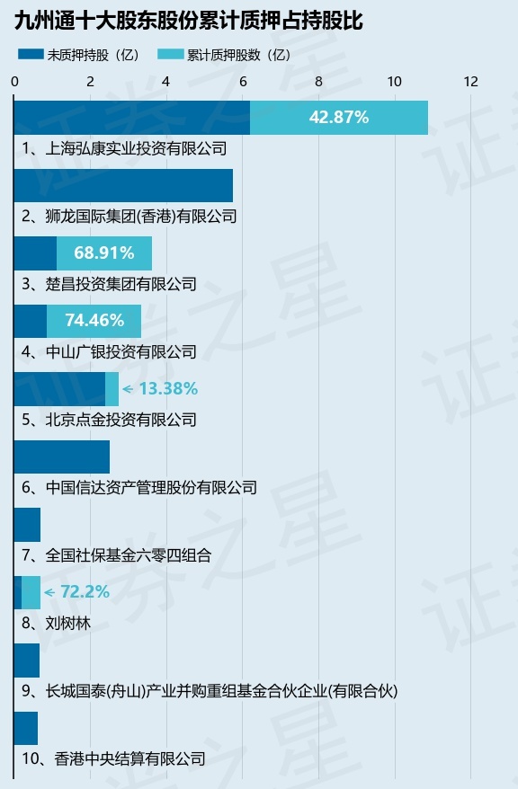 截止本公告日,股东上海弘康实业投资有限公司已累计质押股份4.67亿股,占其持股总数的42.87%,股东楚昌投资集团有限公司已累计质押股份2.5亿股,占其持股总数的68.91%,股东中山广银投资有限公司已累计质押股份2.5亿股,占其持股总数的74.46%,股东北京点金投资有限公司已累计质押股份3700.0万股,占其持股总数的13.38%,股东刘树林已累计质押股份5112.79万股,占其持股总数的72.2%。本次质押后九州通十大股东的累计质押股份占持股比例(占持股比例的计算以公司最新一期财务报表公布的十大股东的持股总数为基准)见下图: