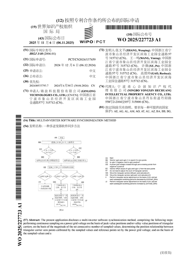 证券之星消息,根据企查查数据显示锦浪科技(300763)公布了一项国际专利申请,专利名为“一种多逆变器软件同步方法”,专利申请号为PCT/CN2024/137459,国际公布日为2025年11月6日。